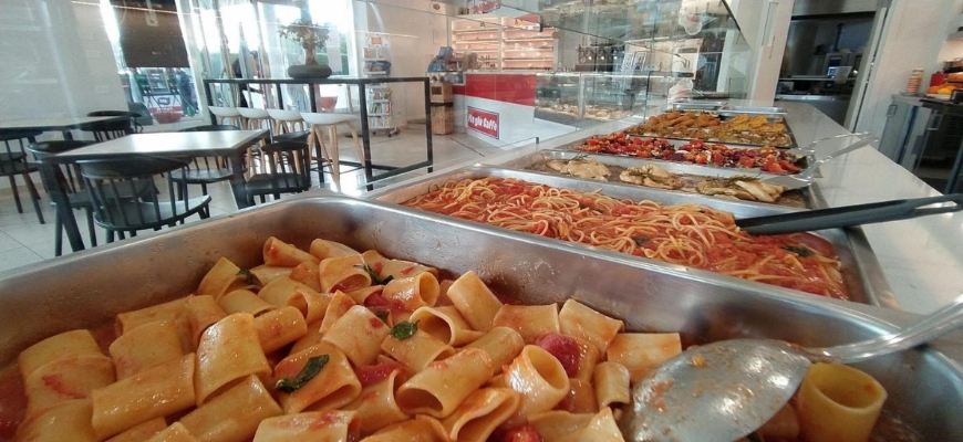 Puoi accomodarti e pranzare in tranquillità, oppure scegliere la formula take away: porti con te ciò che preferisci, caldo e pronto da gustare dove vuoi — in ufficio, a casa o durante un viaggio.